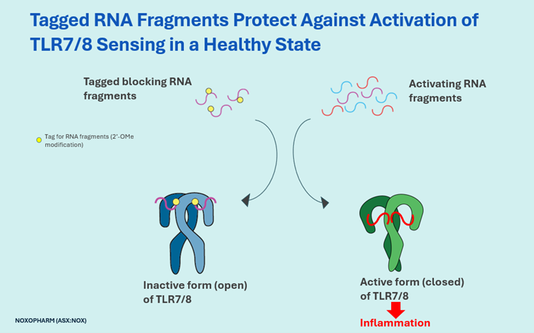 ‘Tagged’ RNA fragments change the TLR7/8 receptors to an inactive configuration and block their activity versus non-tagged RNA fragments activate the receptors and cause inflammation.