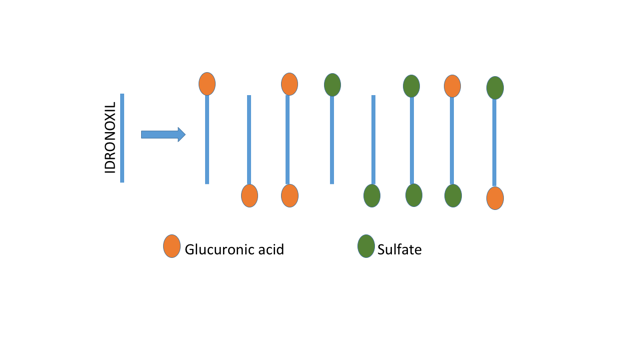 What passes from the lining of the gut into the bloodstream are 8 possible forms of idronoxil. The 8 possible forms come from the fact that the idronoxil molecule has two ends where glucuronic acid or sulphate can be attached. The following diagram shows the 8 possible combinations that end up in the bloodstream.